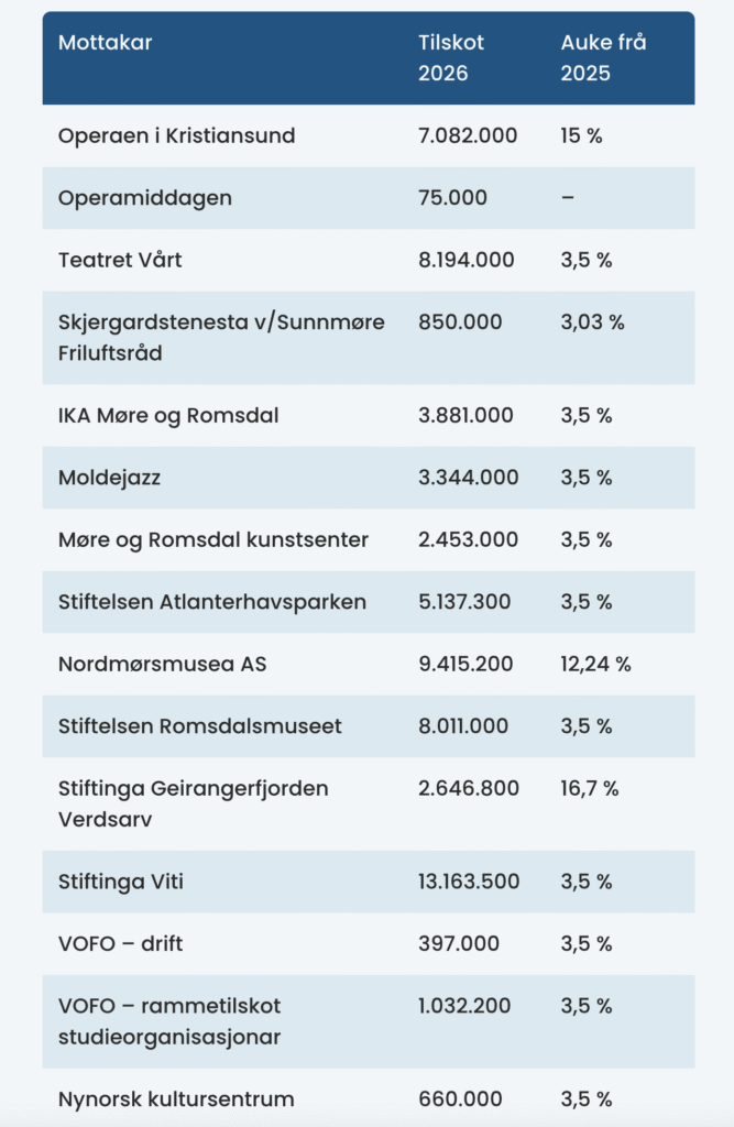 Kultur- og folkehelseutvalget har nylig fordelt 66,3 mill. kroner i driftstilskudd for 2026 til regionale kulturinstitusjoner. De største tilskuddene går til Stiftelsen Viti, Nordmørsmusea og Teatret Vårt.