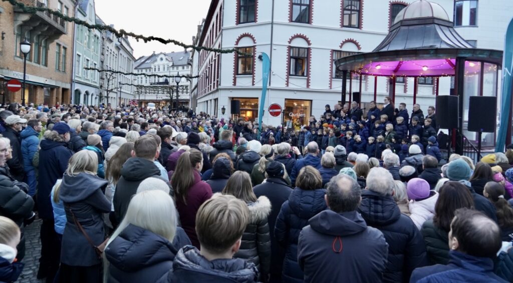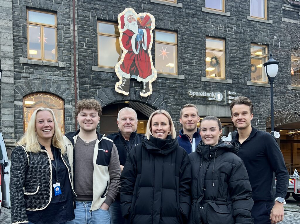 Nysgjerrige turister med toppluer og kameraer tok oppstilling i det Caverion inntok Sankten med både lift og gjerder i formiddag. Lite visste de at en av Ålesunds stolteste tradisjoner var på vei opp på veggen hos Sparebank 1 SMN. Nå er julenissen oppe og for ei skue.