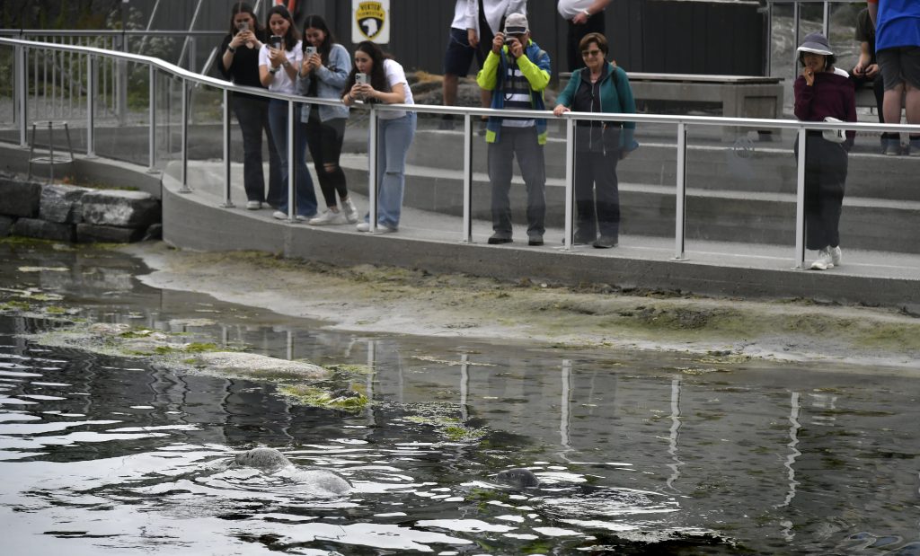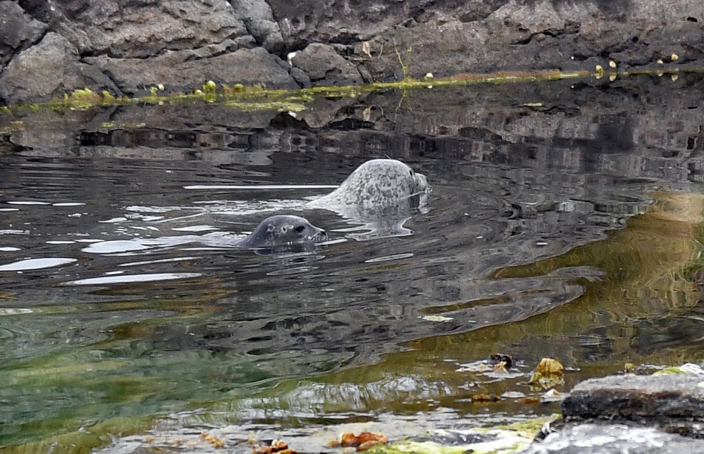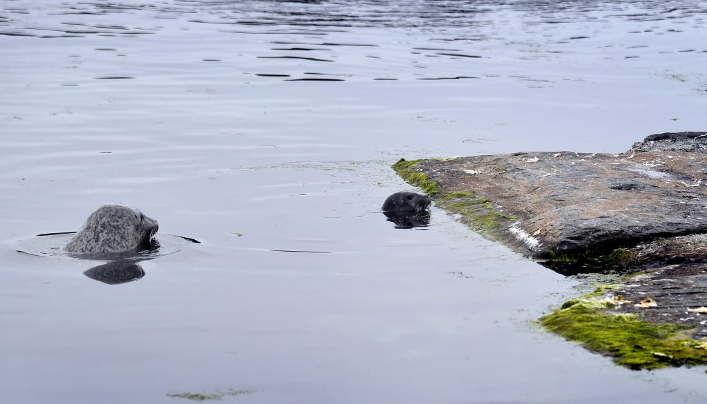 Atlanterhavsparkens uteområdet yrer av besøkende, og noen, ikke alle, oppdager Sylle og ungen hennes som svømmer rundt sammen, men for seg selv.