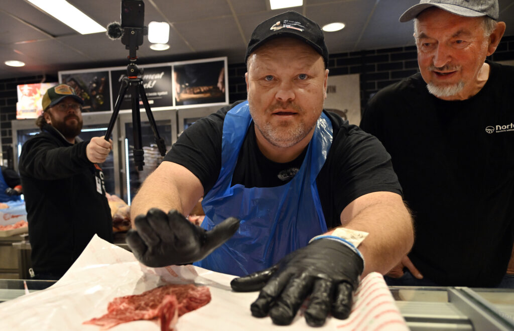 Det ble en stor dag for både ansatte og matinteresserte kunder hos EUROSPAR Moa som hadde kjøpt inn en hel Wagyu-okse, og i tillegg hadde pølsemaker og kjøpmann Tore Solstad på plass for å skjære den ned!