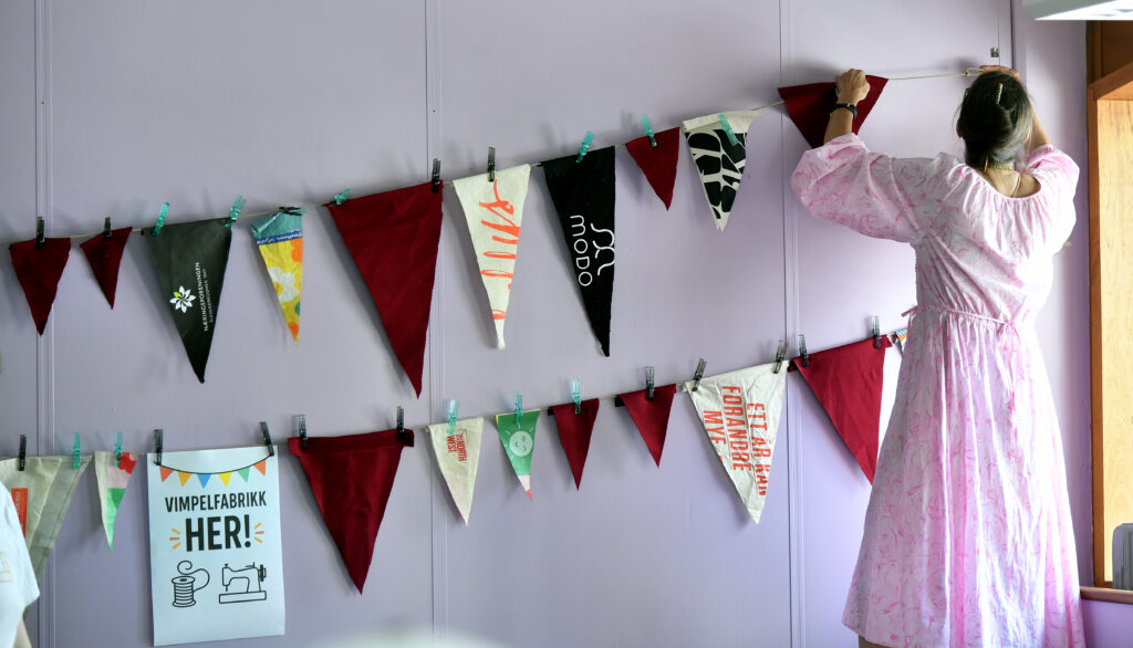 -Maskinene har jo flere programmer for søm, og når en lager vimpler så kan en forske litt med disse sømmene, det gjør ikke noe at de er forskjellige. Men det er vimplene, for flere bypatrioter leverer sine vimpler. Noen kommer med ei gammal skjorte, et laken eller andre ting som kan brukes sier Solveig, og drar fram rødt stoff en finner plassert inn i mellom lenkene som er festet på veggen.