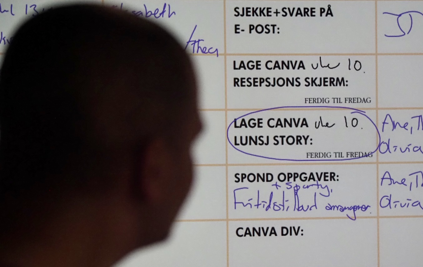 Møterommet i andre etasje. Her fordeles oppgaver som skal løses på huset.
