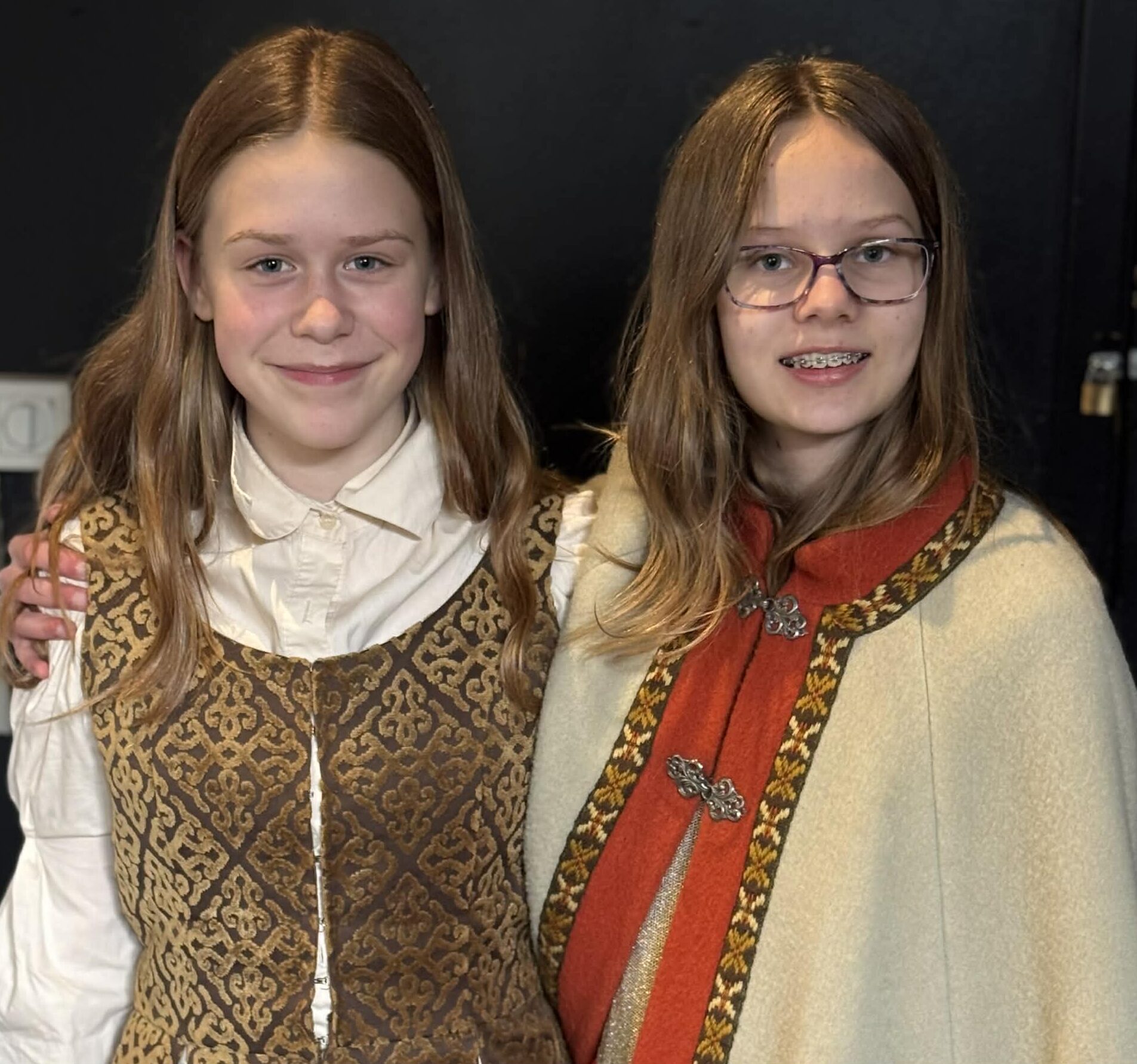 – Vi er veldig fornøyde med kostymene, sier de i kor. – Det er en spennende periode nå. Forestillingen nærmer seg, og vi har akkurat begynt å legge fra oss manus og jobbe med å få inn ordentlige følelser i skuespillet, det er kjempegøy, legger Signe Kristine Halvorsen Almås til, som skal spille både konge og prins.