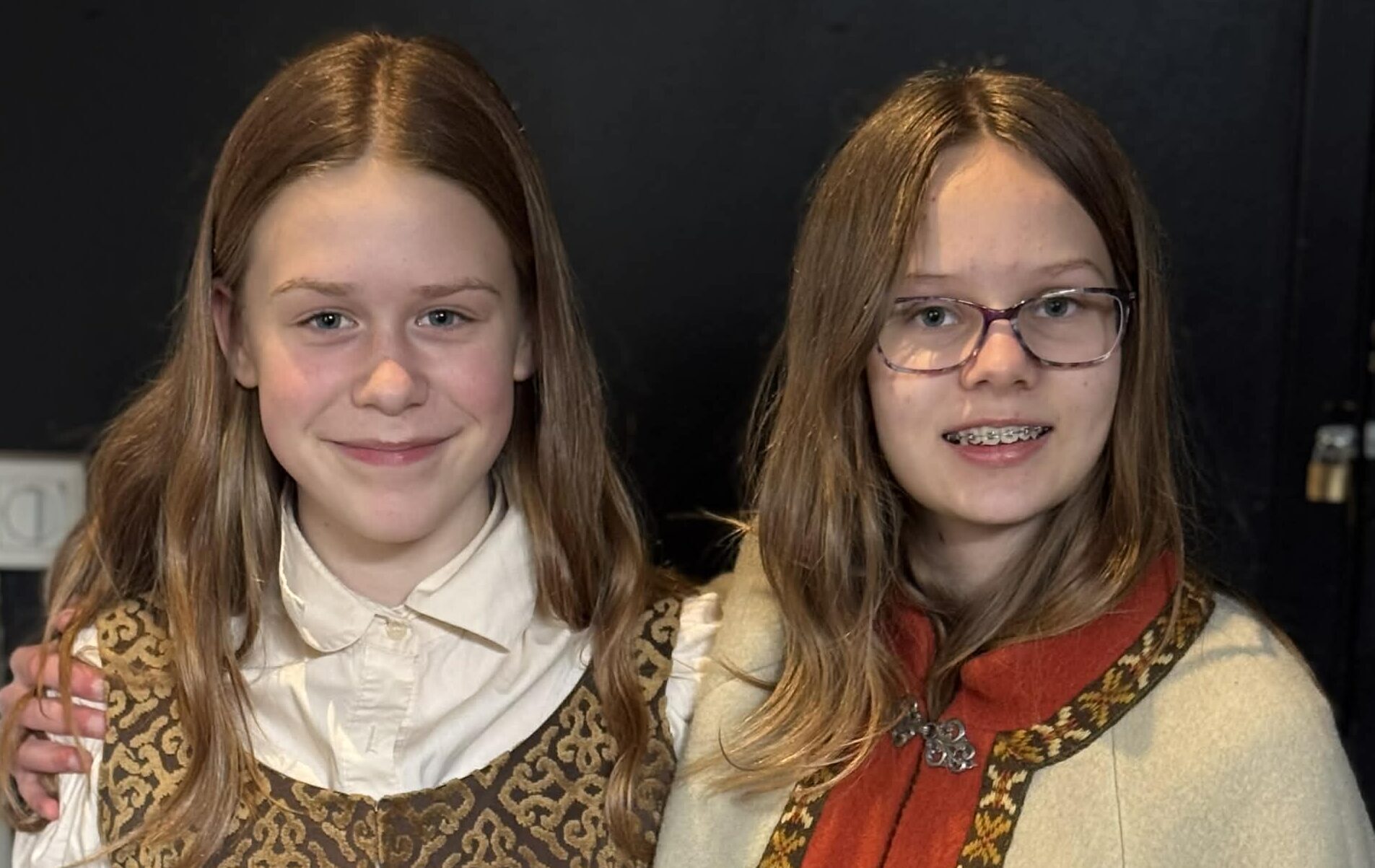 – Vi er veldig fornøyde med kostymene, sier de i kor. – Det er en spennende periode nå. Forestillingen nærmer seg, og vi har akkurat begynt å legge fra oss manus og jobbe med å få inn ordentlige følelser i skuespillet, det er kjempegøy, legger Signe Kristine Halvorsen Almås til, som skal spille både konge og prins.