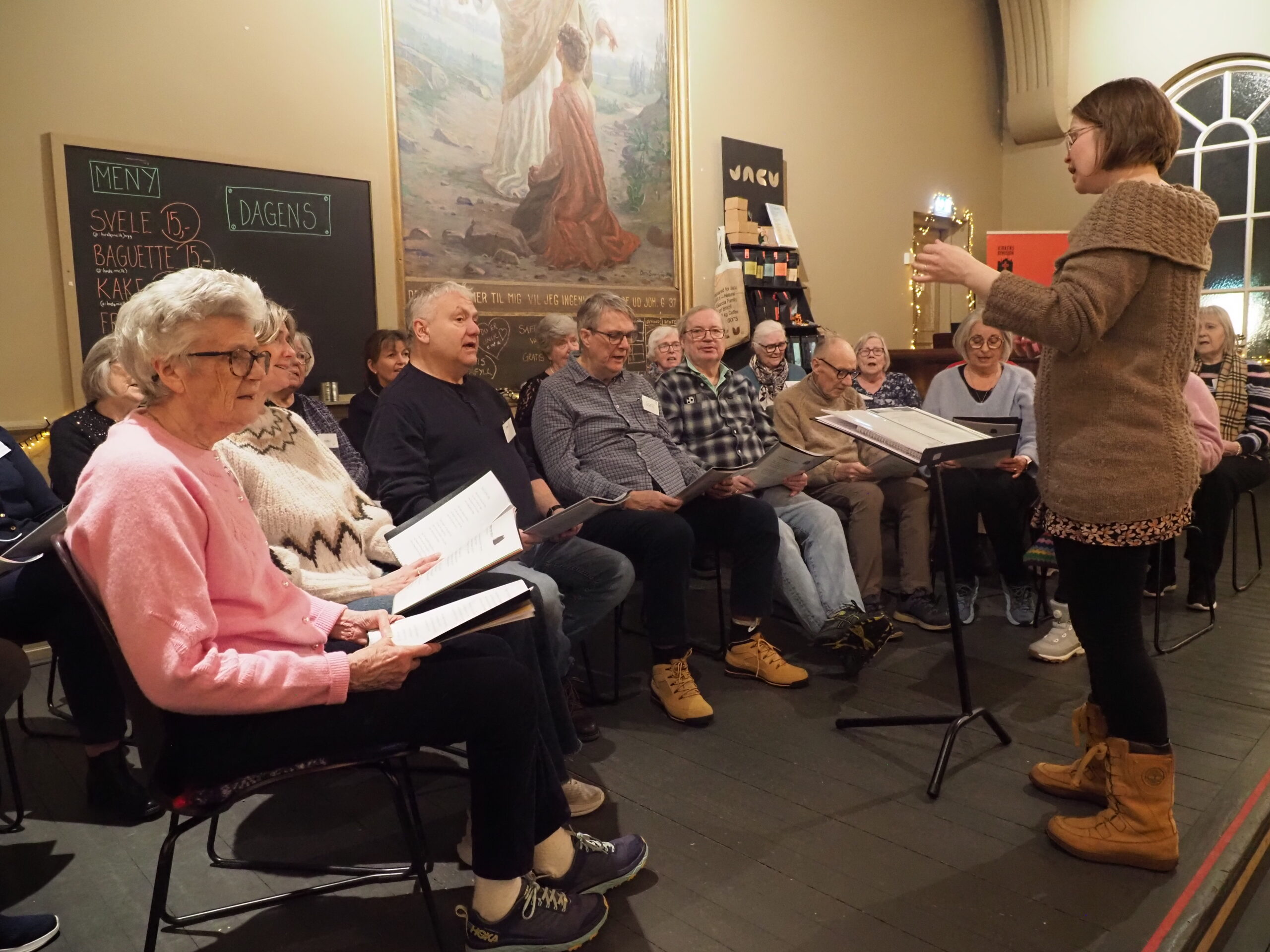 – Musikken aktiverer så mye i oss. Den henter frem minner, følelser, hvordan vi hadde det en gang, og hvordan vi har det nå, sier dirigent Solveig Maria Nedregård som har tatt plass i front. Først oppvarming av både kropp og stemmer. De leker med lyd og armer i været. De ler.