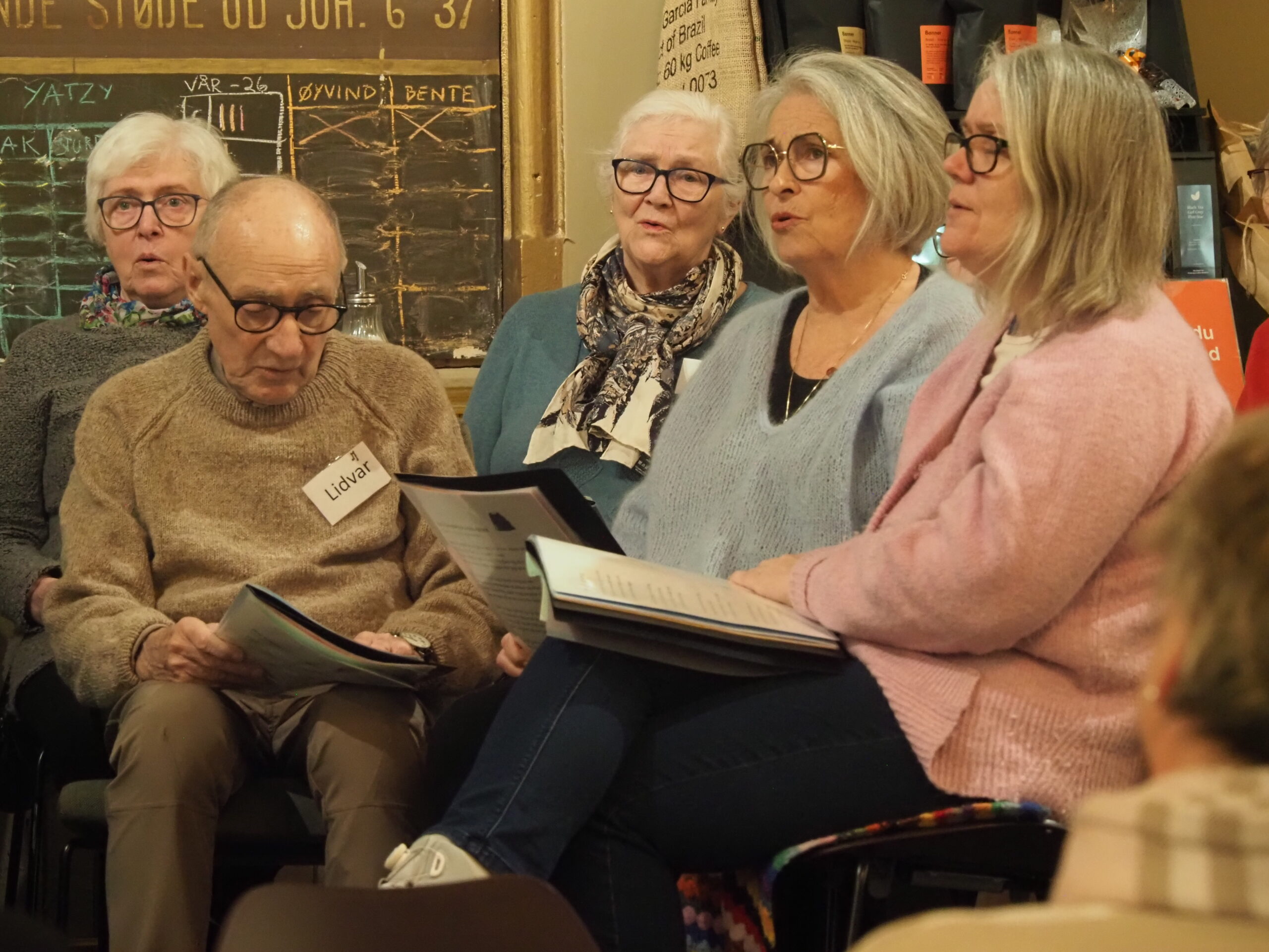 De øver sammen hver tirsdag i lokalene hos Kirkens Bymisjon i Ålesund sentrum. Denne gangen ble kormedlemmene i Demenskoret Sangglede også overrasket med bursdagskake. Også ble det sang! Masse sang.