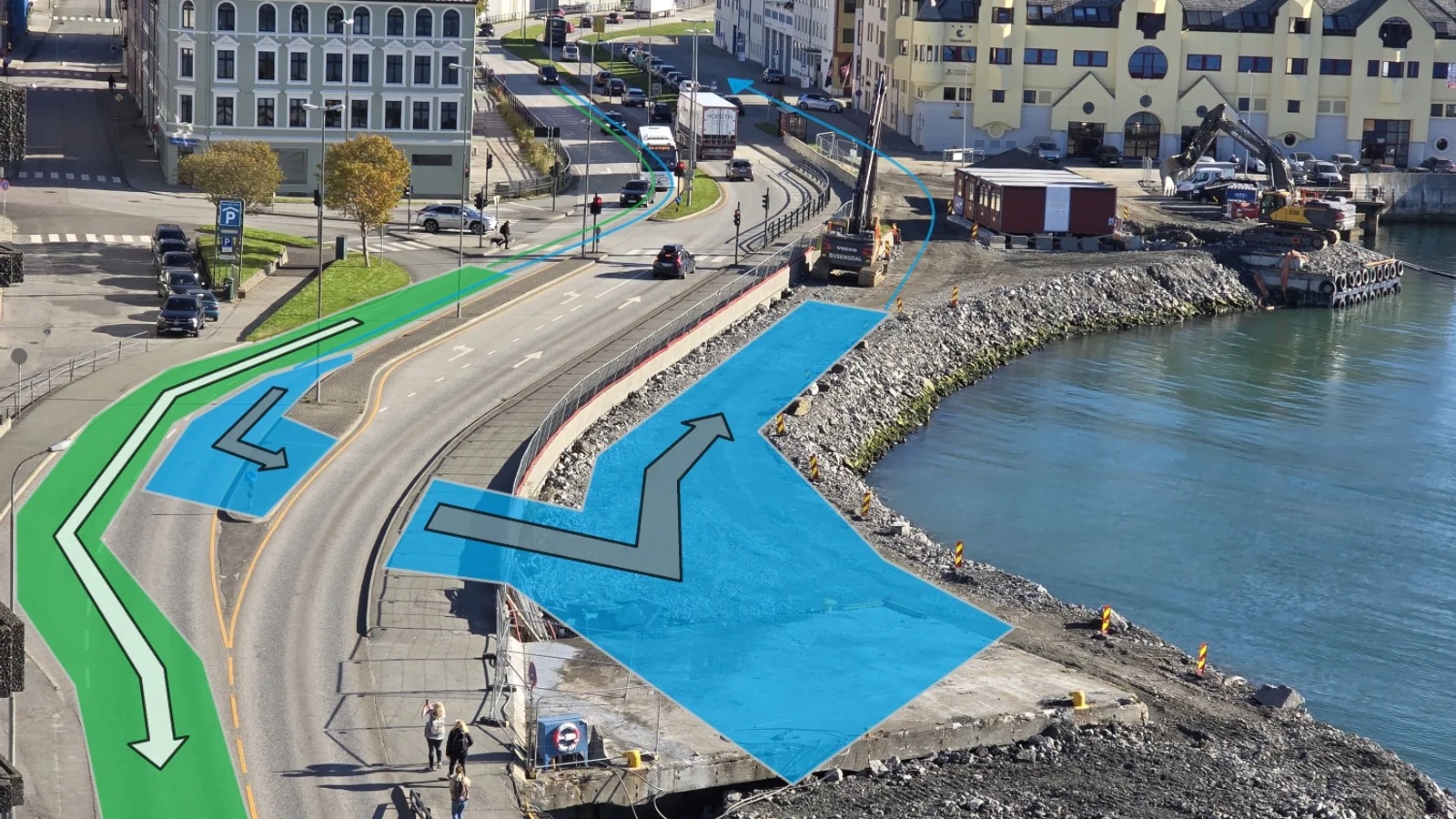 Illustrasjonen over viser nytt kjøremønster. Grønn markering viser hvordan ordinær trafikk bruker busslommen, blå markering viser hvordan lastebilene kommer inn til det nye mottakspunktet. Etter de har tømt lasset sitt fortsetter lastebilene langs fyllingen og Meierikaia. – Som en bonus blir også veien langs meieriet asfaltert, og vi får dermed også fikset en svært hullete vei, sier de.