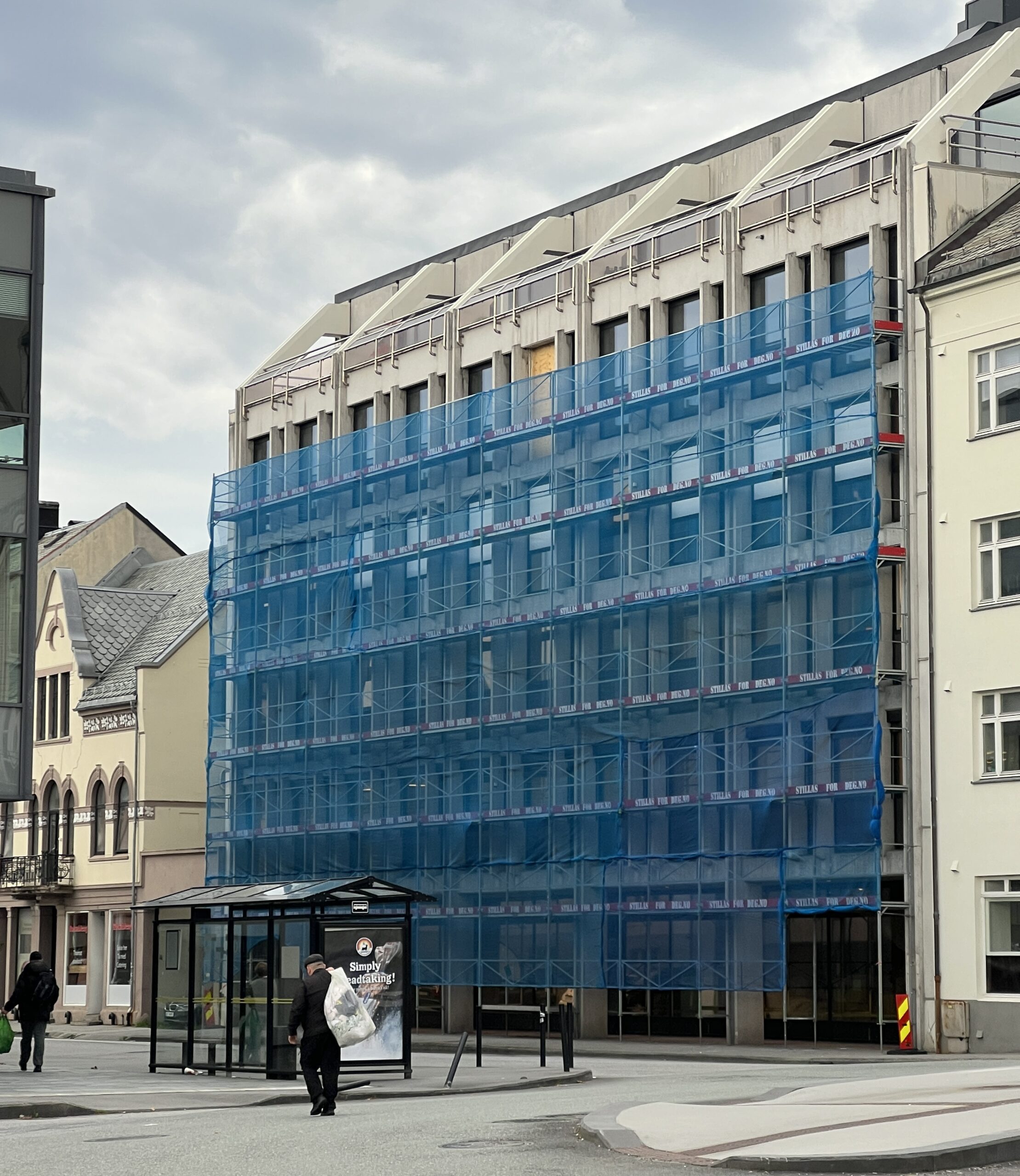 Stillaset som er satt opp, har sin naturlige forklaring. Her er det Fiskebåt i 4. etasje er i gang med oppussing og bytte av vinduer. Samtidig er Utrøna AS i gang med å totalrenovere 5. etasje, som også skal huse en ny bedrift over nyttår.