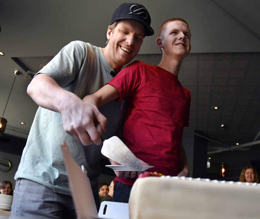 Festen og treffet med alle nære var etterlengtet, og hovedpersonen selv har satt seg litt i utkanten sammen med slektning og kompis Theo Rønstad. De to prater om ”gutteting”, og har fått en fiks ide om å sette nok en rekord.