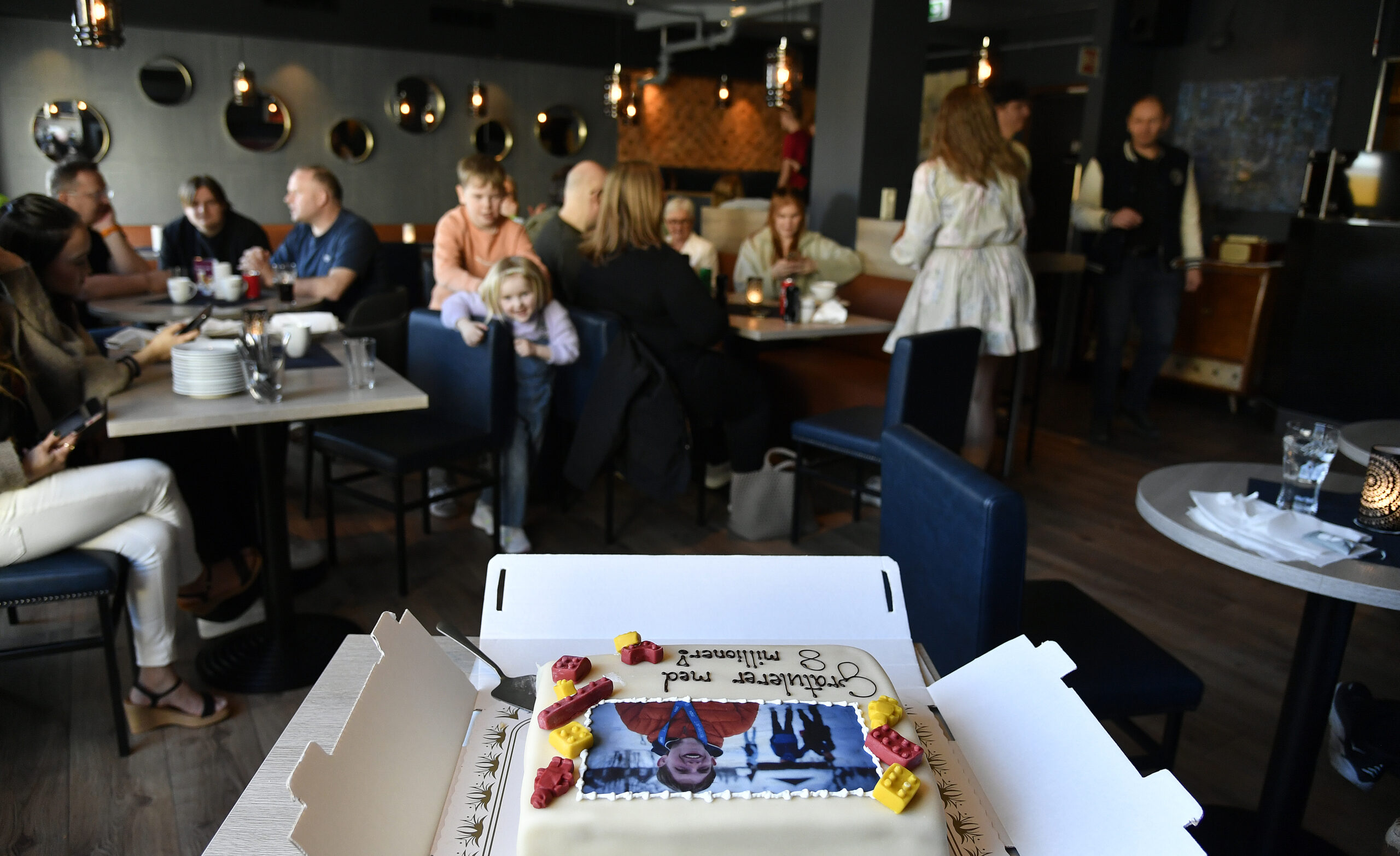 – Kona hadde i forveien bestilt ei kake hos Baker Walderhaug der det skulle stå” Gratulerer med 5 millioner”. Vi lurte jo litt på hvordan det ble, ettersom vi allerede visste at spleisen den hadde passert sju, men tror du ikke de hadde fulgt med? Da Lydia hentet kaken, hadde de ansatte skrevet 8 millioner. Tenk det da, sier han om det lokale engasjementet og alt som dermed var på stell til festen.