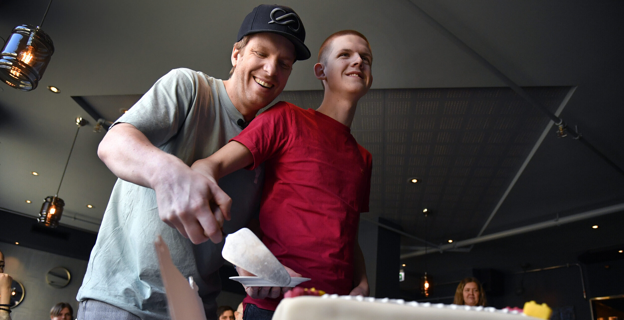 Festen og treffet med alle nære var etterlengtet, og hovedpersonen selv har satt seg litt i utkanten sammen med slektning og kompis Theo Rønstad. De to prater om ”gutteting”, og har fått en fiks ide om å sette nok en rekord.