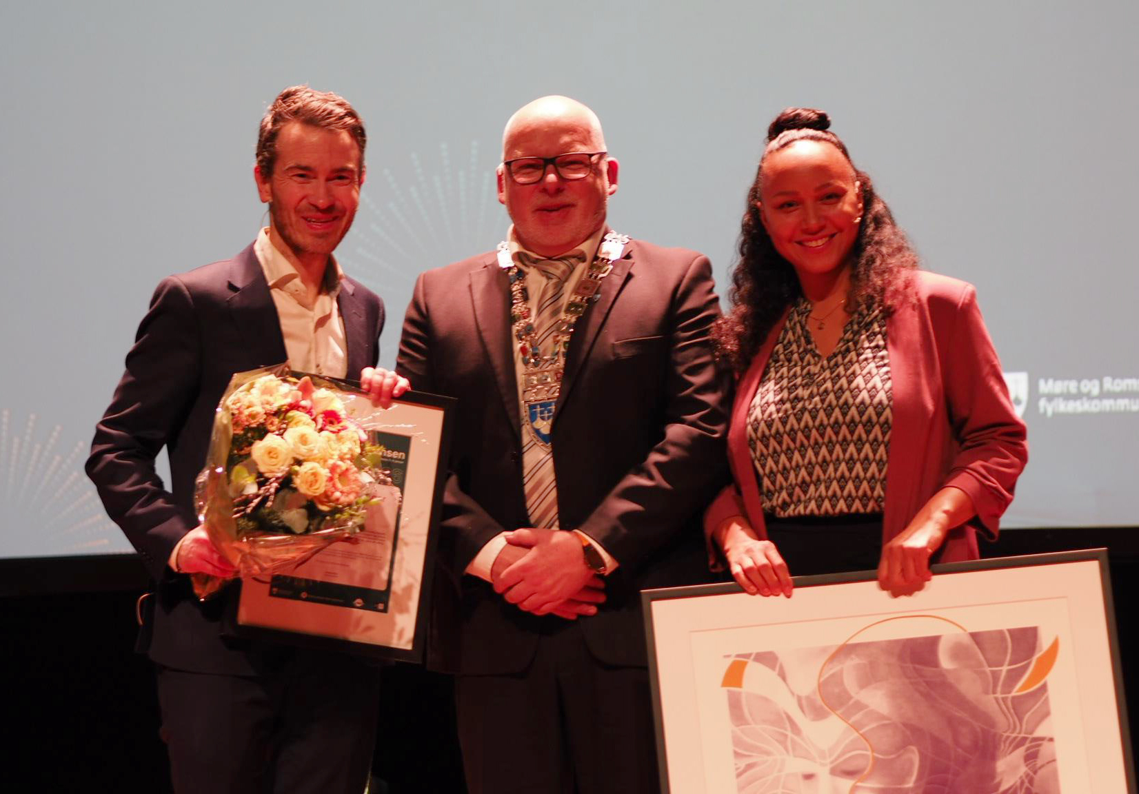 Til stående applaus fra salen mottok teatersjef Kristian Lykkeslet Strømskag og kunstnerisk leder for avdeling barn og unge i Ålesund, Zezé Kolstad, prisen "Årets regionbygger 2025" på vegne av Teatret Vårt under Nyttårskonferansen i i Molde torsdag kveld.