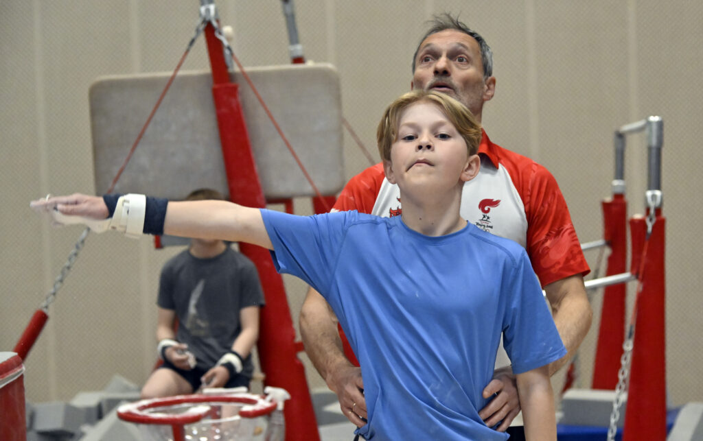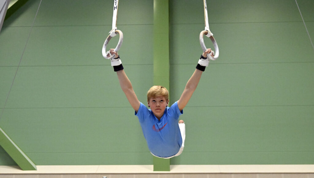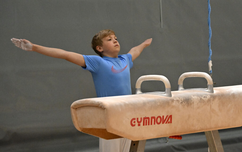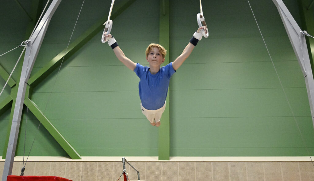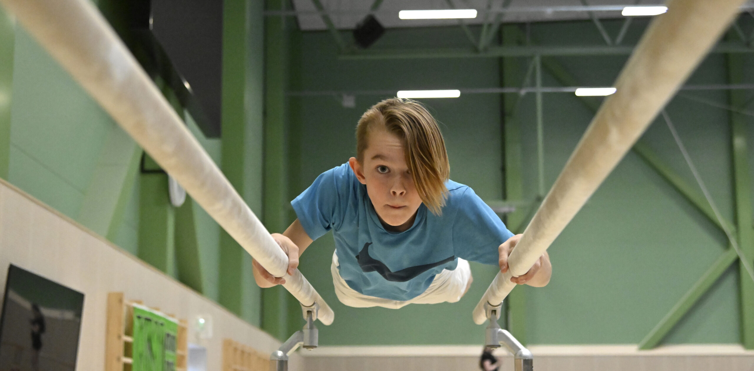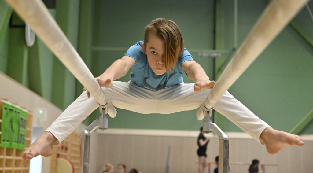 Samson vet nøyaktig hva han skal gjøre i skranken. Med et konsentrert blikk og kroppsbeherskelse er 11-åringen på toppen i løpet av sekunder. Og når øvelsen er unnagjort svinger han seg elegant på siden og står stramt på bakken.