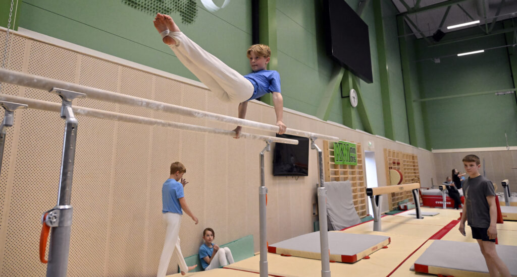 Frikk går opp i håndstående på skranken, med rette knær, stille, før han slepper seg i en sving. Også han med nedslag i god stil. 12-åringen Henrik likeså. Det ser så lett og elegant ut, og det er jo hele meningen.