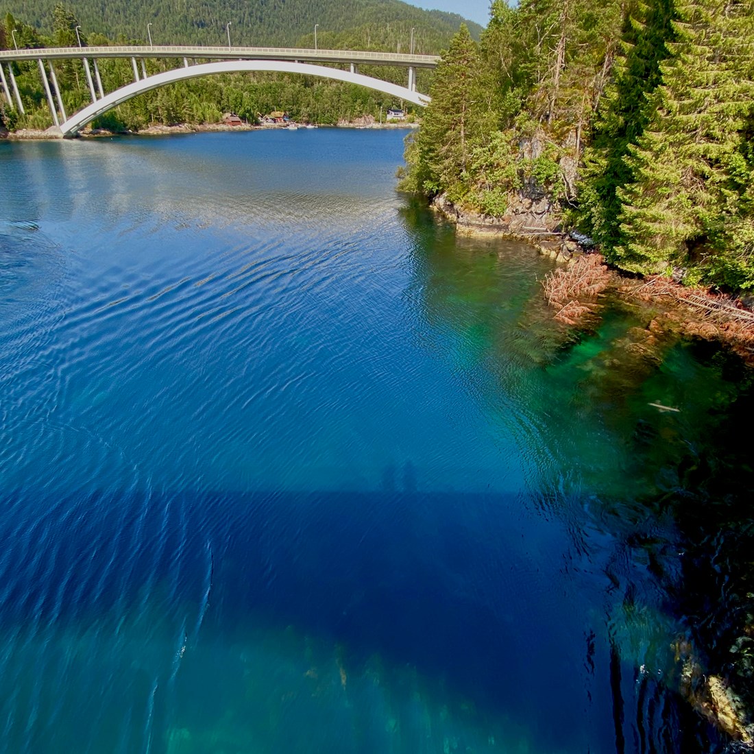 Spennende når den gamle broen speiler seg i den fasinerende Skodjestraumen. I front den nye broen.